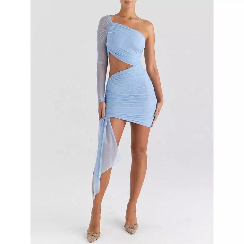 Our dress boasts a unique blend of features that make it an irresistible choice for any fashion-forward wardrobe. The inclined shoulder design adds a touch of asymmetry, bringing a modern twist to classic elegance. The two-layer mesh fabric, combined with a strapless neckline, creates a stunning silhouette that flatters your figure. The above-knee length is balanced by a tasteful backless design, making it both daring and graceful. Moreover, the sleek sheath silhouette, solid pattern, and natural waistline accentuate your curves in all the right places.