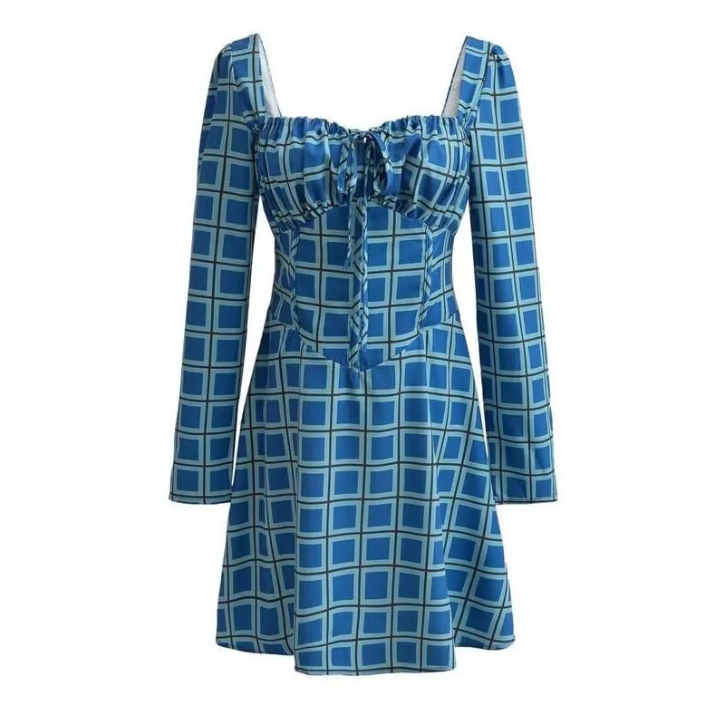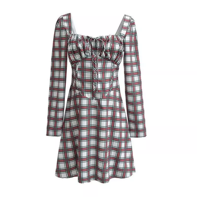 Chic Tartan Backless Mini Dress with Square Collar and Lace-Up Detail