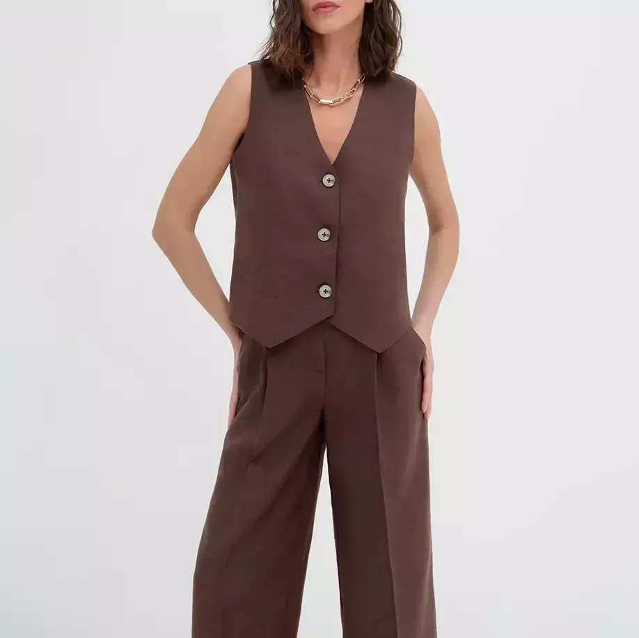 Experience the difference with our specially crafted set. The regular fit flatters a range of body shapes, providing a graceful silhouette. Crafted from a premium mix of cotton and linen, the woven fabric ensures breathability and longevity, suitable for all seasons. Its solid pattern exudes a timeless charm, and the tasteful button accents add a refined edge. The sleeveless vest top offers freedom and flair, embodying high-street fashion at its finest.