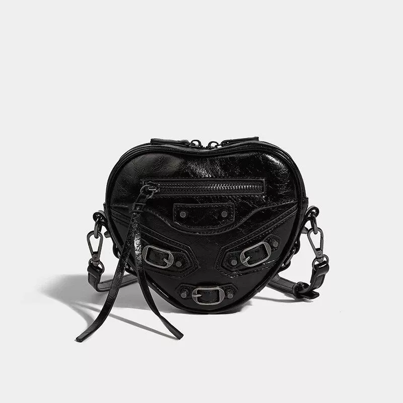 Crafted from premium PU leather, this handbag exudes elegance and durability. The striking black color and solid pattern create a look that’s both classic and contemporary. With its unique heart shape and eye-catching rivet decoration, this bag is sure to turn heads and make a statement wherever you go.