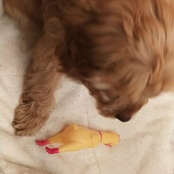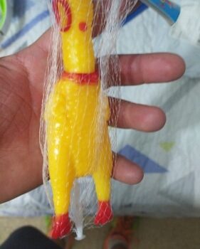 There isn't much to say. It's a yellow rubber chicken. It looks just like the picture and arrived as promised. Dog very much liked