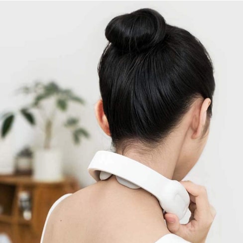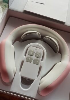 I am suffering from neck pain badly. I feel much better every time after I use the massager for 15 minutes. It’s wireless and has a separate remote. It’s very moveable and portable. The two connectors are full of elasticity. They are able to move down and extend out a little bit, so it fits my neck perfectly. It’s really really comfortable and soft. It can warm up right around my neck area. The warming sensation is really nice. It delivers pretty decent pulsations. The battery life is really amazing. I recharge it about every 3 weeks. It is doing really great. It would be better if the remote has a screen and can show the current level and mode.