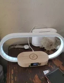 Modern and practical design. You can charge your mobile phone in it. You have time too. And as a lamp, 3 shades of light and different intensities in each one. Easy to turn on and off, with a simple touch on the structure. It is very light due to its design. Very happy with the purchase.