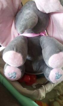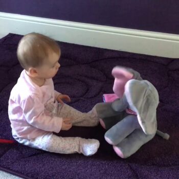 Your child’s new elephant friend has two fun functions: press the left foot to play an interactive game of peek-a-boo; press the right foot to hear the song “Do Your Ears Hang Low” in a cute child’s voice. During both play modes, the elephant’s ears move and flap, like the elephant has come to life: it’s sure to delight your little one.