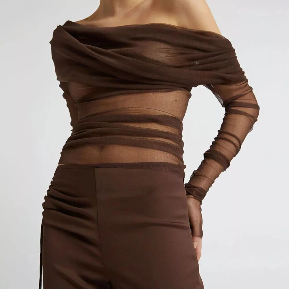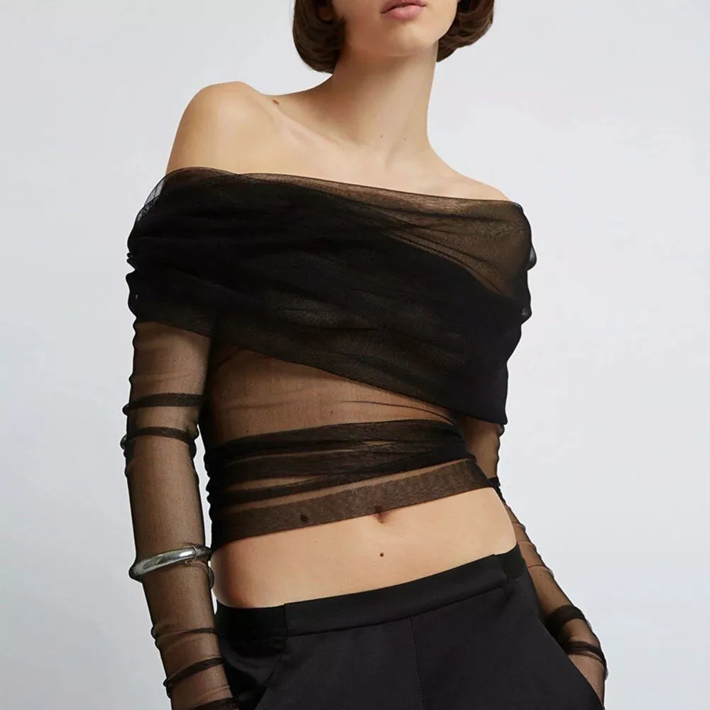 Elevate your summer wardrobe with our Sexy Sheer Mesh T-Shirt – a captivating blend of style and comfort. Embrace the allure of a slash neck, long sleeves, and an off-shoulder, backless design that effortlessly enhances your silhouette. Crafted for the confident and daring, this shirt is perfect for the modern woman who seeks both fashion and comfort.