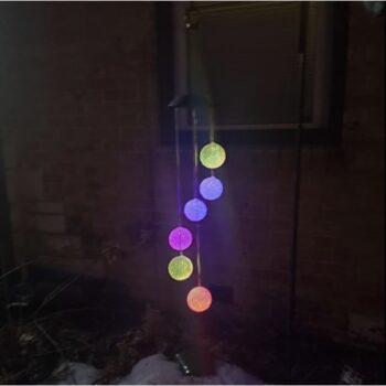 Cute solar chimes. I hang it by my window and use it as a night light. It goes on when it gets dark and stay on for about 3 hours. It is very relaxing watching it changing color when laying on bed.