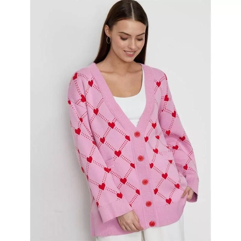 Women’s Oversized V-Neck Knitted Cardigan with Heart Print